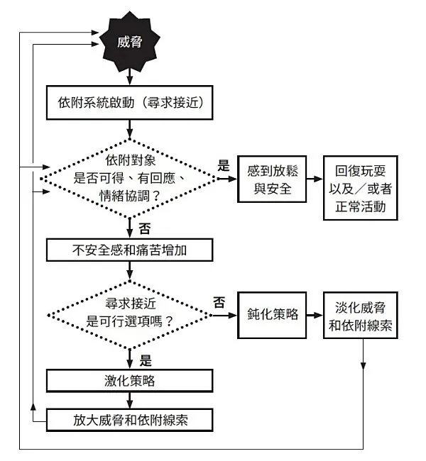 学者马里奥.米库林瑟和菲立普.薛佛曾经提出一个模型,说明依附系统的功能和动态,3我把它转化成流程图,来展示不同依附体验的产生过程。首先,当儿童遇到威胁(无论是感受上或实际上的威胁,还是生理上或心理上的威胁),他们都会想靠近依附对象,以寻求保护。如果此时依附对象确实可得、有所回应,而且满足了他们的需求,儿童就会获得安全感,能够回去玩耍或继续探索;如果依附对象并不可得或没有回应,缺乏避风港可以求助的儿童就可能会采取钝化(deactivating,关闭) 或激化(hyperactivating,启动) 的策略,来回应自己的依附需求。