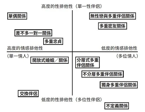 每種不同的CNM風格或關係組成,會各自擁有不同的性開放程度、情感投入程度,以及不同類型的關係協議或規則。我依照情感排他性(emotional exclusivity) 與性排他性(sexual exclusivity) 為軸,繪製了一種主要的CNM關係組成與風格(見圖4.1)。橫軸是情感排他性,左側為高排他性,右側為低排他性;縱軸是性排他性,上方為高排他性,下方為低排他性。請注意,這兩個軸線並不是理解各種CNM的唯一切入點,請自行選擇對你有幫助的部分即可。另外,雖然我把某些CNM放在圖上某處,但永遠都有例外,屆時大家請自行判斷你們的CNM應該落在何方。